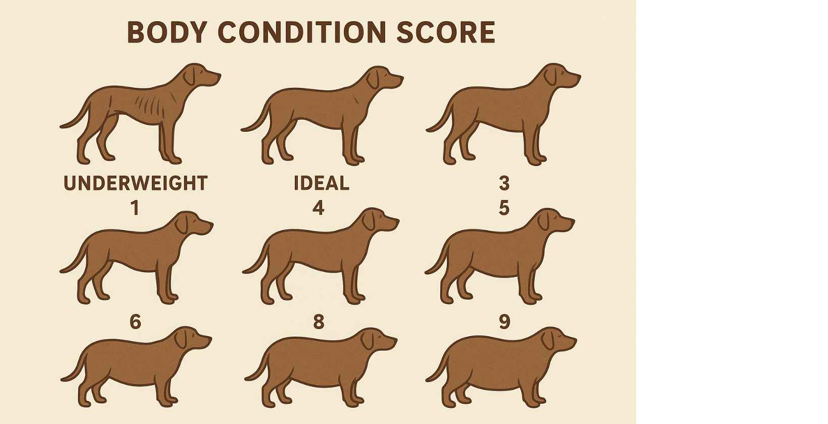 Ein mögliches Untergewicht des Hundes lässt sich feststellen, indem man seinen Vierbeiner mit dem unten eingefügten Bild des BCS vergleicht.
